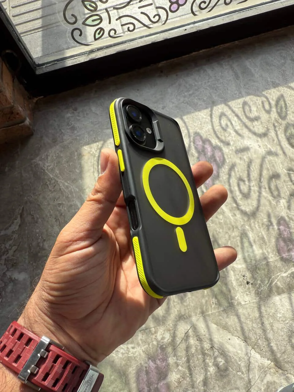 - سازگاری کامل با MagSafe: مجهز به حلقه داخلی مگسیف که امکان اتصال آسان و شارژ بیسیم سریع با لوازم جانبی مگسیف را فراهم میکند. (میتوانید اشاره کنید که حلقه زرد رنگ، ظاهر آن را تکمیل میکند)